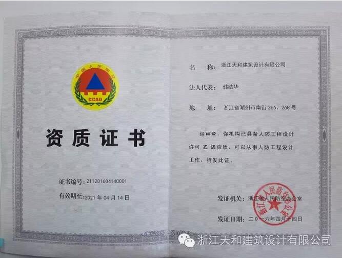 熱烈祝賀天和設(shè)計(jì)獲得浙江省人民防空辦公室頒發(fā)的人防工程設(shè)計(jì)乙級(jí)資質(zhì),為浙江省內(nèi)首批,湖州市獨(dú)家!自此,我公司可承接浙江省范圍內(nèi)建筑面積2萬(wàn)平方米以下人防工程建設(shè)項(xiàng)目(不包含各類人防指揮所)主體工程、配套工程及地面附屬設(shè)備設(shè)施用房的設(shè)計(jì)業(yè)務(wù)。